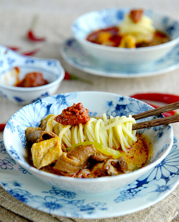 材料:面条、豆泡、干元蘑、西葫芦、叻沙酱、椰浆粉、叁峇辣酱