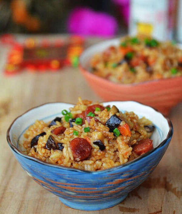 材料:香菇,广式腊肠,大米,胡萝卜,姜,老抽,料酒,盐,糖
