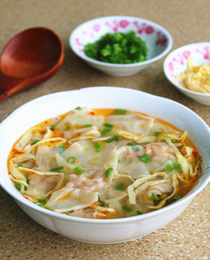 食材:小馄饨皮200g、猪肉馅150g、熟油10毫升、盐2克、鸡蛋1个、鸡精2克、榨菜10克、虾皮5g、葱花5g、辣椒酱少许