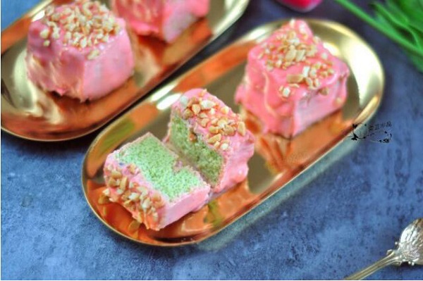 烤好的蛋糕切成方块,淋上与淡奶油混合的巧克力,加上画龙点晴的花生碎,不仅颜值高,口味也不错。入口先有颗粒感,香脆花生,然后是柔软香甜,舌尖上的花生香和巧克力的甜已经混合起来了,嚼起来非常有口感,下面的柔软的蛋糕,真的是很不错的搭配。