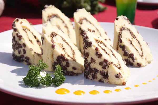 6、出炉后冷却至不烫手,撕去油纸,抹上果酱;在蛋糕片的一端,用刀轻划三刀,卷起后用油纸包好,冷藏20分钟后切片即可食用。