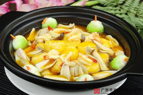 6、准备好砂锅煲,倒入煎好的玉子豆腐,放入虾仁和蔬彩粒加入适量水煮沸腾,再加入少量的调味料关火即可享用。
