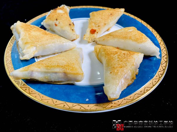 粉角是广西传统名小吃,以米粉作皮、瘦肉和马蹄剁碎作馅,一口咬下去,既有粉皮的爽滑,也有馅料的香鲜,层次感丰富。老师说包成等边三角形的粉角,才是标准的粉角哦!
