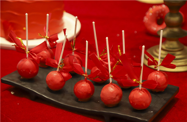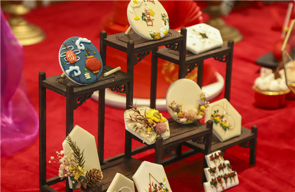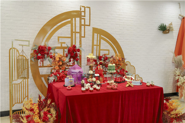 中式复古展台,古朴典雅的中式婚礼,以红色系为主,由蛋糕、饼干、裱花为主的甜品,嵌入多种中国元素,种类全部是西点。以其喜庆的氛围、鲜艳的色彩和满满的仪式感,红金镶嵌的中式婚礼别有一番韵味。