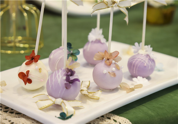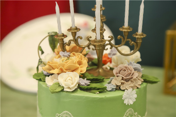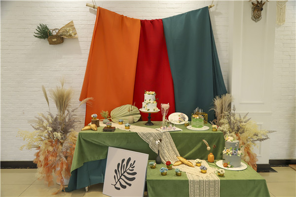 水蓝色、青草绿的裱花蛋糕使整体展台颇有森系仙气,带着绿野仙踪的感觉,在作品中加入了棒棒糖元素作点缀,多了一些可爱的气息。橙色、红色、绿色的景布,使视野思维更加开阔,整个展台都活跃起来,清爽而自由。