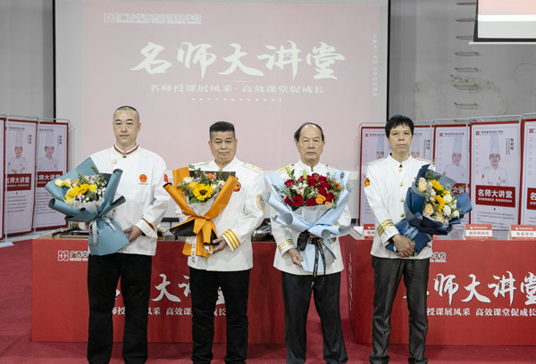 本次名师大讲堂的特邀大师——注册元老级中国烹饪大师、我校终身客座教授何逸奎大师;中国烹饪大师、广西烹饪协会理事、我校运营总经理黄盛大师;中国烹饪大师、我校热菜实操教师李西安大师;中式烹调技师、我校烧腊卤水实操教师吴杰文大师。四位大师为同学们现场讲解和演示梧州纸包鸡、薪火燎香牛、鲍拼两味鸡、海底捞月、油底走浆、骏马奔腾油鸡这几道集经典、创新于一体的菜品制作。