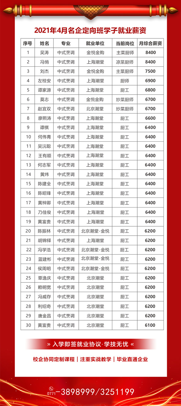 广西华南烹饪技工学校与国内500余家优质餐饮用人单位达成长期合作协议,定向培养行业紧缺的复合型烹饪人才。学生入学即签订就业服务协议,毕业后面向全国各地双向选择,对口安置就业。