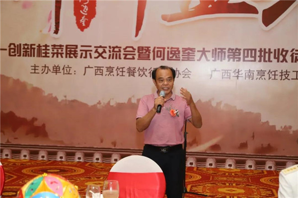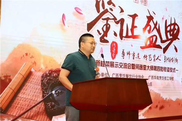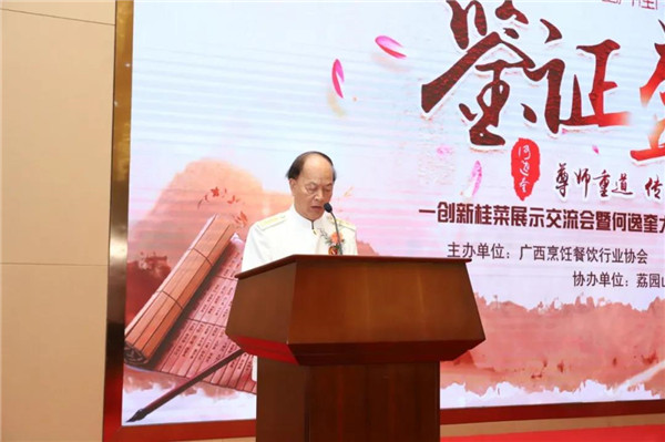 随后广西华南烹饪技工学校翟维铁先生继续致辞,何逸奎大师一生都在为桂菜事业奉献,向世界传递着来自桂菜、来自中国传承千年的饮食文化,为中国餐饮名片书写了浓重的笔墨。广西华南烹饪学校将会响应党与政府“提升桂菜品质,扩大桂菜影响力,拓展桂菜市场”的号召,与桂菜泰斗何逸奎大师共同努力,为发扬桂菜作出贡献。
