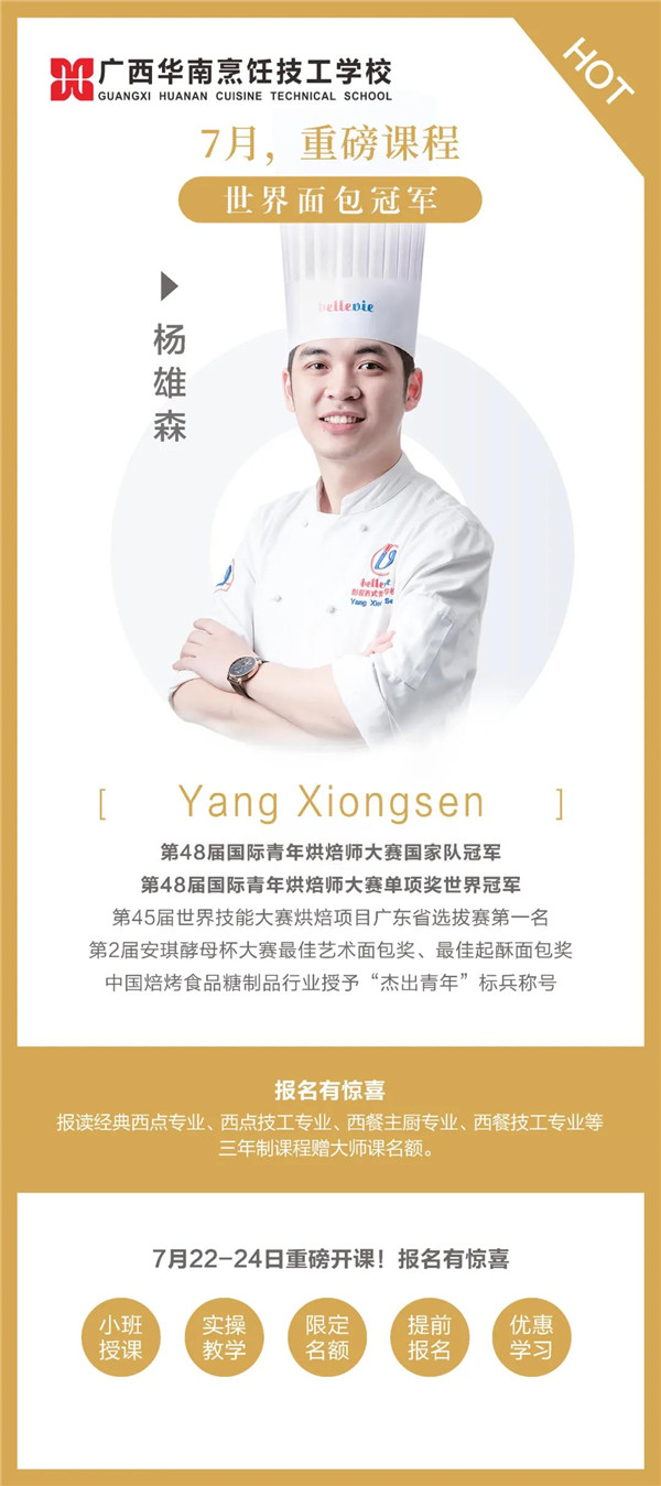 人们眼中的天才之所以卓越非凡,并非天资超人一等,而是付出了持续不断的努力。1万小时的锤炼是任何人从平凡变成世界级大师的必要条件。任何人在自己的行业内,能够得到世界级大师的指导都是莫大的幸运。本周7月22-24日拥有世界面包制作水平的杨雄森大师来到华南,为学子们带来世界级的面包实操教学,解锁你的面包“超能力”。