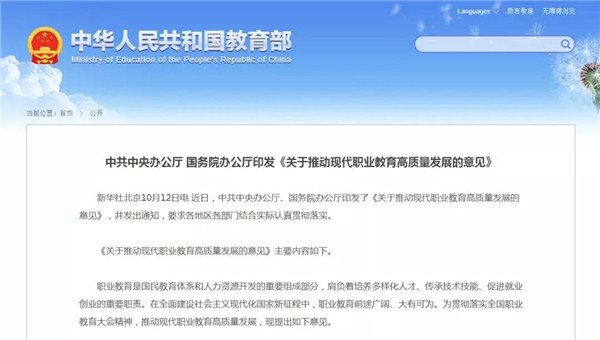 10月12日,中共中央办公厅、国务院办公厅印发了《关于推动现代职业教育高质量发展的意见》。其中指出,“加快建立“职教高考”制度,完善“文化素质+职业技能”考试招生办法。”“加强职业教育理论研究,及时总结中国特色职业教育办学规律和制度模式。”