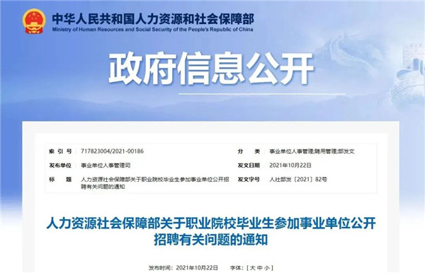 10月22日,人力资源社会保障部印发《关于职业院校毕业生参加事业单位公开招聘有关问题的通知》,也明确指出了,职校生同样也拥有报考事业单位的资格!