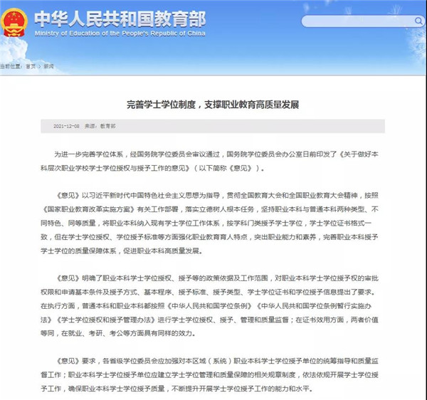 近日教育部消息,为进一步完善学位体系,经国务院学位委员会审议通过,国务院学位委员会办公室日前印发了《关于做好本科层次职业学校学士学位授权与授予工作意见》(以下简称《意见》)。