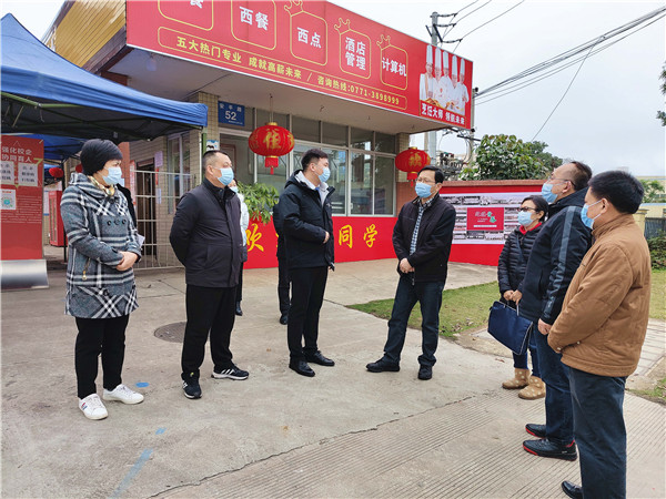 2022年2月10日下午,南宁市人大常委会副主任黄均宁、广西-东盟经开区管委会副主任符飞龙等一行莅临广西华南烹饪技工学校东盟校区检查督导新冠肺炎疫情防控工作,我校校长闫冠英、副校长刘婷、校长助理罗洪彩、校审计督查宇翔、东盟校区主任谢全林等校领导陪同检查。