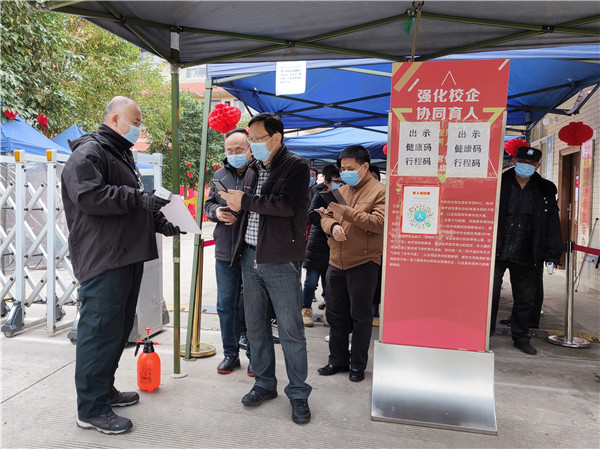 黄主任对我校目前防疫工作的各项措施给予了充分肯定,并对门卫管理、快递物流管理、校园卫生管理、学生管理等方面的工作提出了指导意见。