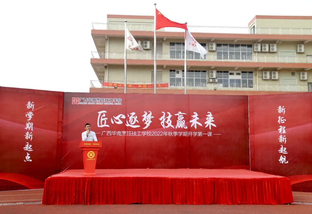 广西华南烹饪技工学校认真落实上级关于2022年秋季开学疫情防控工作的要求,如期开学,同学们安全返校。9月16日上午,我校东盟校区全体师生齐聚操场,聆听校长助理梁精华老师讲授《开学第一课》。