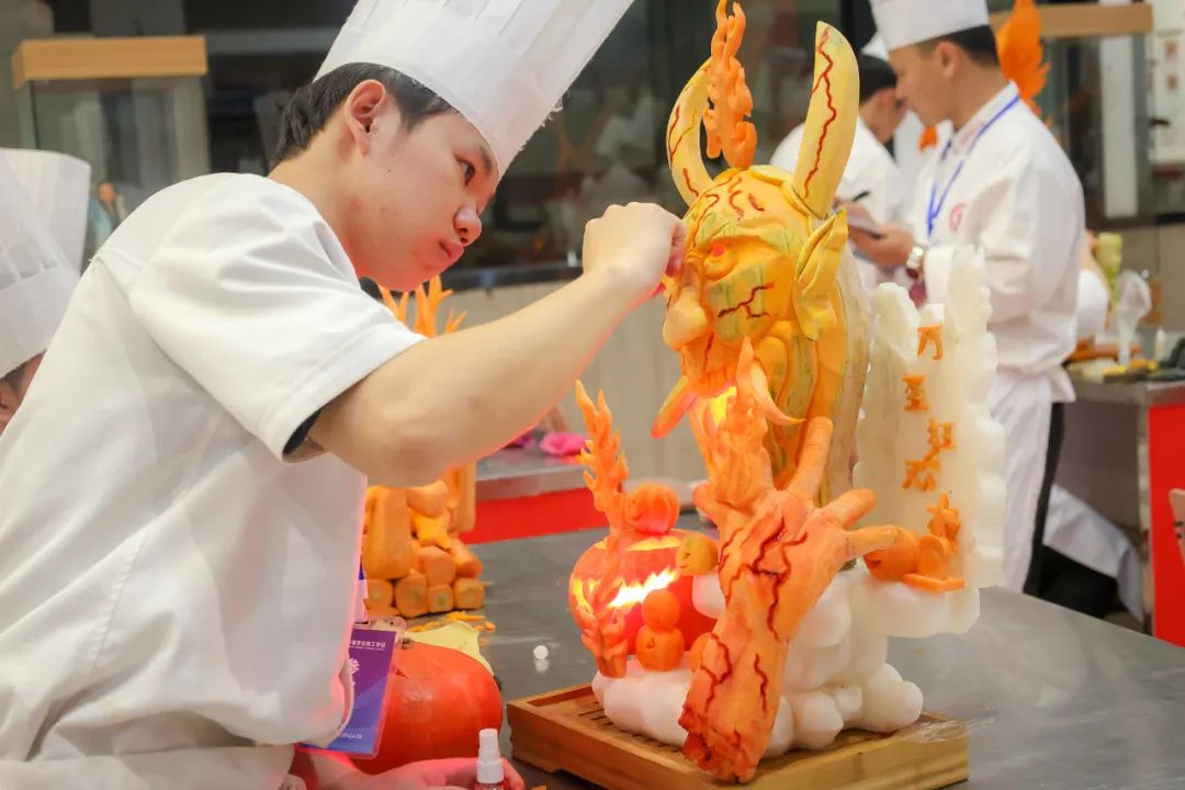 伴随着比赛的开始,选手们纷纷开始拿起手中的果蔬和雕刻刀开始创作,只见他们凝神聚气、胸有成竹、手起刀落,根据比赛的主题发挥着自己的创意和刀工,精益求精的工匠精神在一雕一琢间展现得淋漓尽致。
