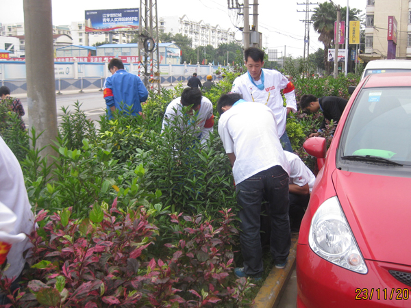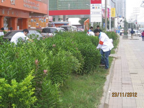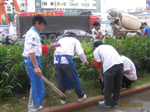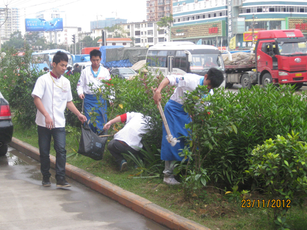 以身作则,从我做起,弘扬清洁绿色生态文化、倡导干净爱绿护绿新风。最近,由广西华南烹饪学校老师及学生自发组织成清洁志愿者,到学校附近一些公路及绿化带清理白色垃圾和杂物,积极地展现出首府青年的新风范、新形象;参与管护,从小事做起,带头实践清洁绿化承诺,争当生态南宁建设良好氛围的先行者,得到了路人的一致好评。