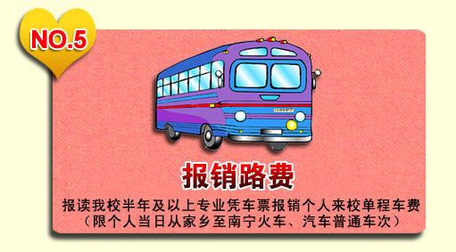 报读我校半年及以上专业凭车票可报销个人来校单程车费(限个人当日从家乡至南宁火车、汽车普通车次)