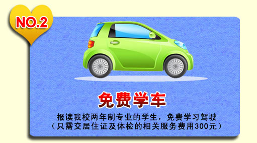 凡报读我校两年制专业的学生,免费学习驾驶(只需交居住证及体检的相关服务费300元)