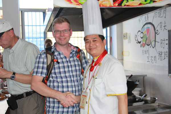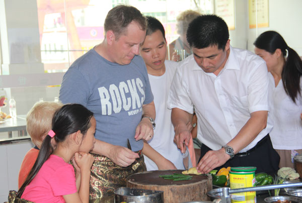 虽然语言的障碍使得在交流方面有点不方便,但也抵挡不了东方美食对瑞典朋友的吸引。为了能让外国友人亲手烹制中国菜肴,广西华南烹饪学校特别安排由老师先操作,之后在老师的指导下让外国友人亲手体验。