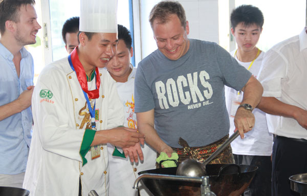 瑞典友人在老师的指导下练习翻锅
