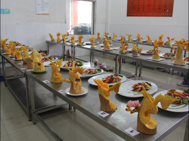 2013年7月20日两年制大厨精英114班毕业考试,在广西华南烹饪学校大学路校区举行。同学们早早开始了进入准备阶段,本次考试内容包括《像形拼盘制作》、《雕刻技能》、《刀工技能》、《热菜技能》以及《中式烹调师中级理论》等科目。经过了前段时间的复习准备,同学们对考试显得很有信心,很多参加考试的同学表示,他们喜欢烹饪更希望能通过专业的学习将自己的整体水平提高上去,以适应社会不断发展的脚步。希望同学们能够考出好成绩。