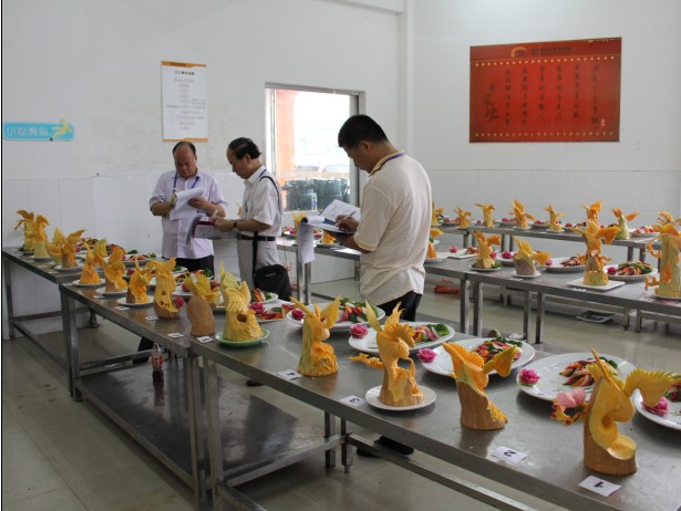 本次考核的评委有:中国烹饪协会理事、广西烹协常务理事、全国餐饮业国家一级评委、广西区烹饪协会常务副会长何逸奎、广西区鉴定中心李德枝、西园鉴定所刘桂林所长、广西华南烹饪学校创就业指导中心朱主任。