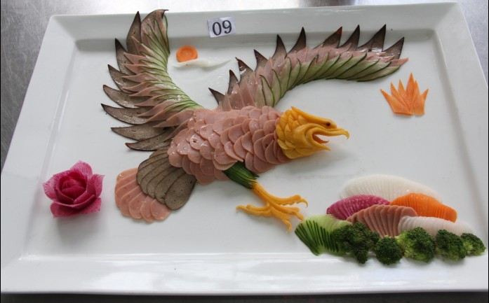 学生“雄鹰展翅”拼盘和“喜鹊月季”雕刻作品