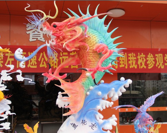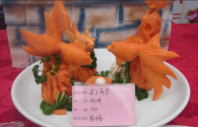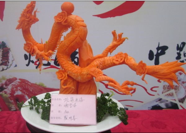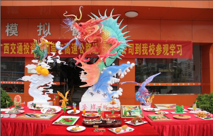 而那翻滚在水里鱼化龙,舞动着身姿,似要腾空跃起而去。想要一飞冲天的鱼化龙,身高数尺,给人一种遐想。谁也不会想到这栩栩如生的鱼化龙,竟然是一件巨大的雕刻作品。若不是亲眼所见,谁也不会相信造物者之神奇,而完成包括巨型雕刻在内的作品的,不是别人,正是广西华南烹饪学校莘莘学子们。学生们用精湛的技艺,惟妙惟肖的把作品雕刻而出。