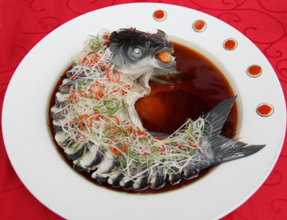 一道“清蒸鲤鱼”,惹人无限怜爱。只是普通的食材,再经过简单的搭配,就形成了这道让人欲大饱口福的美食。鲤鱼弯身吞珠恍惚拼尽了全力,红椒鲜艳得虽然有些刺眼,但是搭配上细细葱丝和姜丝还是给人呈现出美的感觉。
