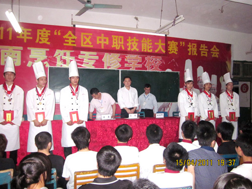 4月15日晚,我校烹饪事业部2011年度“全区中职技能比赛”报告会在实操楼六楼多功能教室举行。报告会以“总结经验,分享心得”为主题,校领导、各班主任及10届、11届的同学出席了报告会。