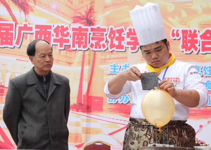 广西烹饪协会常务副会长、国家高级评委何逸奎大师观看华南学子表演秀