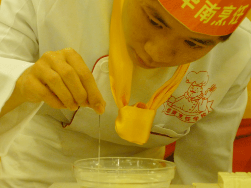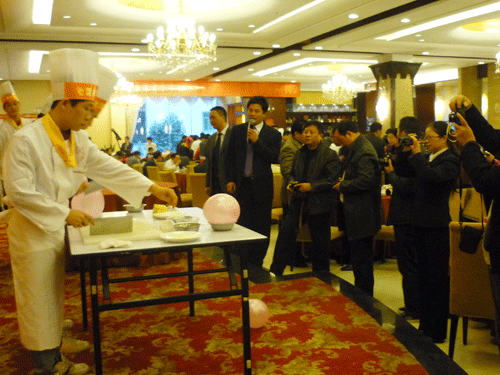 在活动现场,我校学生在大赛上精彩上演了气球上切肉丝、钉子顶气球切萝卜丝、切豆腐穿针、蒙眼在气球上切萝卜丝等节目,吸引大批市民驻足观看和媒体的报道。活动上,我校学生表现出的高超技能和熟练的刀工,赢得了活动主办方和各领导的充分肯定和现场观众的一阵阵掌声。