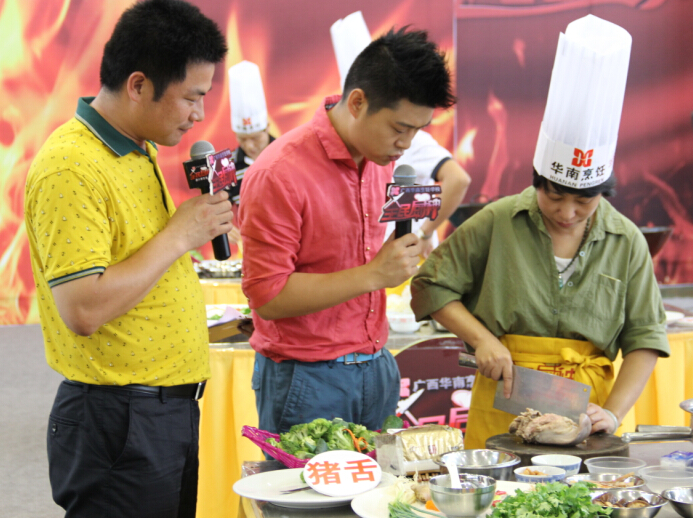 6月12日上午,广西综艺频道——《全民厨神》第二季10进6烹饪比赛在我校激情上演。担任此次比赛的评委依旧来自广西华南烹饪学校的专业负责人、就业指导中心主任、广西名厨专业委员会副主任朱伟;中国烹饪大师、国家级评委闭思惠;中国烹饪大师、国家级评委王卫东。