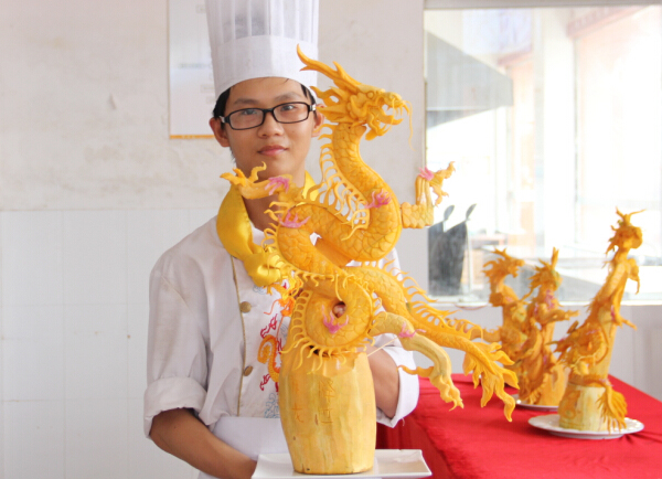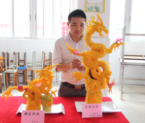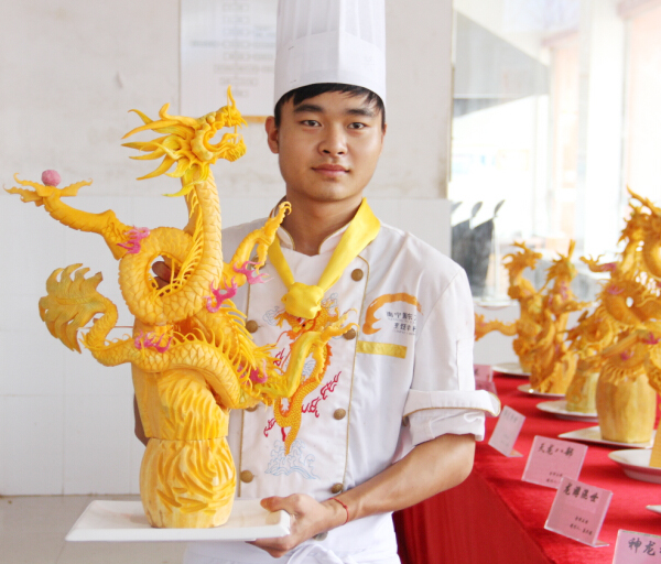 这次雕刻考试要求每位学生用南瓜在规定的时间之内雕刻一只盘旋腾飞的龙。据了解食品雕刻艺术讲研的是构图造型艺术的完整统一,要求造型构图协调、自然、和谐,组装时要注意零部件与整部件,主体与陪衬之间的比例关系。