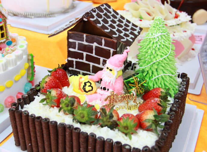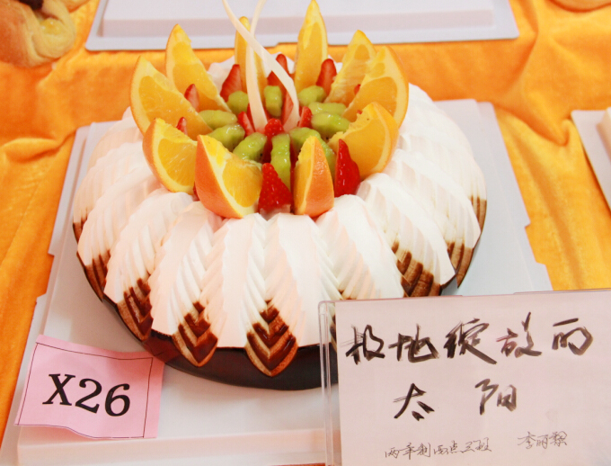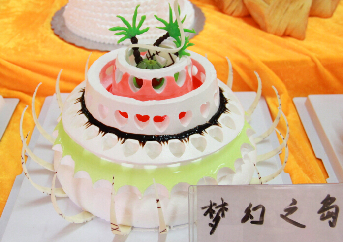 参赛选手在比赛教室为自己的作品忙碌着。打发奶油、调色、原料调制......参赛选手表情专注、动作谨慎。“手要稳,心要定,一气呵成”是西点抹胚的前提,现场巡视的评委老师对选手的认真态度很是认可。奶油从裱花嘴中慢慢吐出,力度的掌控、花型的勾勒......比赛时间有限,高手对决,更是一丝一毫不敢马虎。一阵紧张忙碌过后,选手们的作品已可见雏形。比赛进行地如火如荼,现场“大师”们的表演精彩纷呈,欢快祥和的“梦幻乐园”蛋糕,结合圣诞老人的表现形式,巧克力扇骨、奶油扇坠惟妙惟肖,配以古城堡,风格独特,文化韵味十足。整体设计可谓充分体现了中西合璧的精髓之美。栩栩如生的小动物,娇姿欲滴的花朵.....“梦幻之岛”、“极地绽放的太阳”、“青青子吟”、“黑色星期舞”、“空城”、“花开富贵”......一件件艺术品让人目不暇接。选手们的制作精细度以及对艺术的品鉴、精妙技艺的创新让人赞叹、折服。