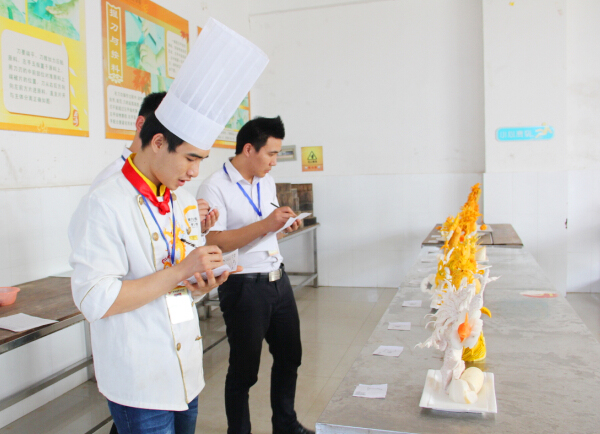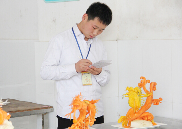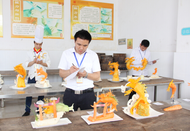 此次考核由广西华南烹饪学校雕刻大师杨大师担任评委,杨大师细致认真的为每一道作品打分,评分结束后,杨大师详细的做了点评,鼓励同学们在掌握了扎实的基础之后,多发挥想象,创新出更多别样的作品出来。在此次雕刻基础阶段考核中,学子们把平日所学的发回的淋漓尽致,雕刻出了不少好的作品出来。在作品展示过程中笔者看到平日里的果蔬在学子们的手中雕刻成一件件艺术品,得到了老师们的一致好评。