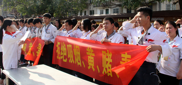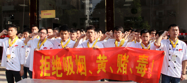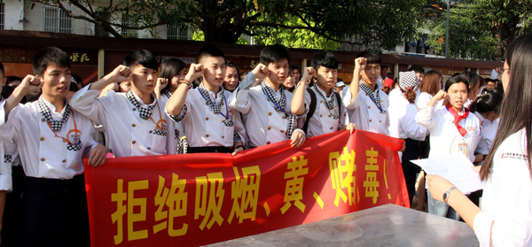 4月16日,为了响应南宁市关于《南宁市控制吸烟规定》文件,我校根据《南宁市控制吸烟规定》要求,结合学校实际,对全体师生进行了拒绝“吸烟、黄、赌、毒”的宣传教育活动。宣誓、条幅签字活动、“吸烟、黄、赌、毒”的危害知识讲座,在校园里悬挂了“拒绝吸烟、黄、赌、毒,营造和谐校园”的宣传标语,营造良好的宣传氛围。