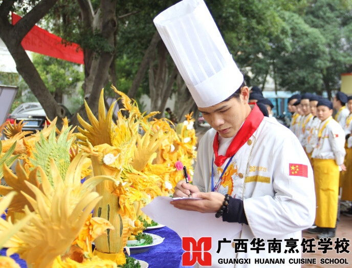 近日,广西华南烹饪学校的操场上,一条近五十米的“美食长廊”吸引了众多学子围观,成为校园里的一道风景线。走进一看,原来是同学们热菜、凉菜、刀工、雕刻阶段考核的作品展。
