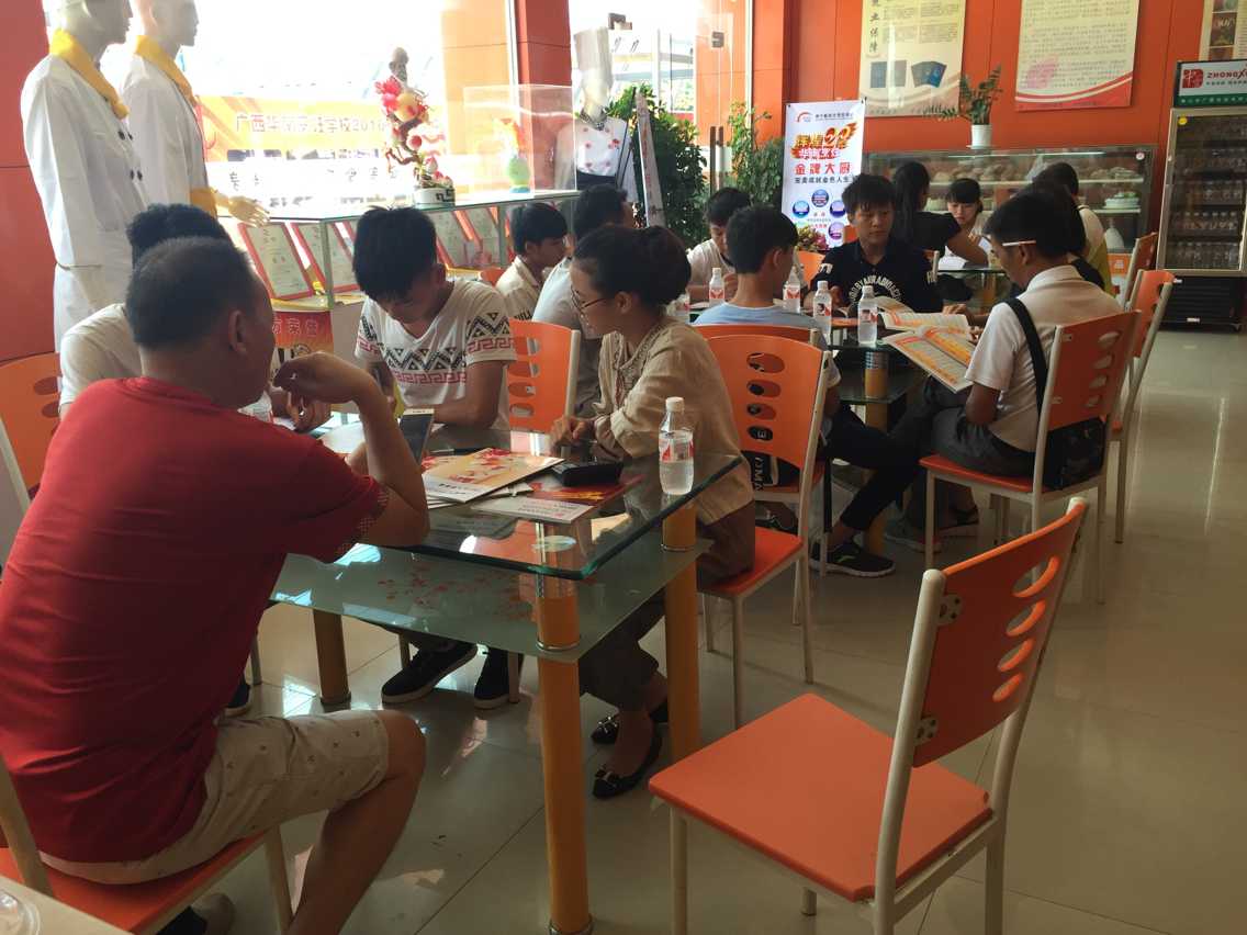 在广西华南烹饪学校的咨询报名中心,前来咨询的家长和学生们络绎不绝,咨询大厅里呈现出一派繁忙景象。