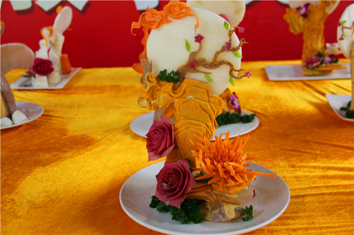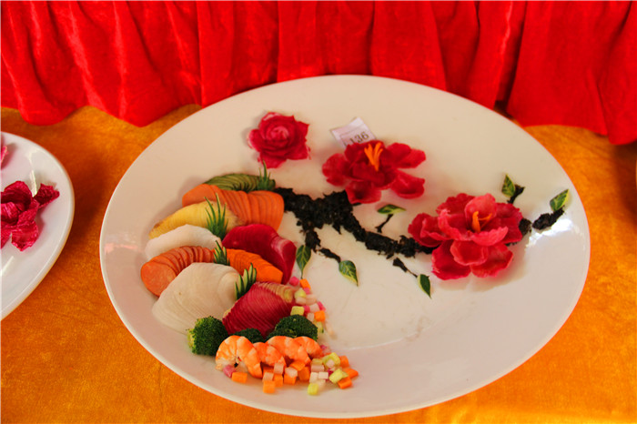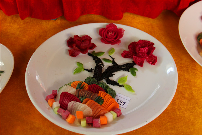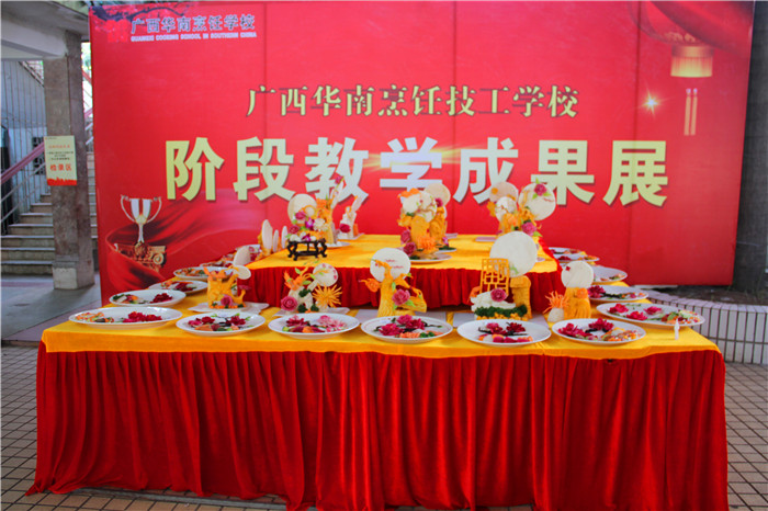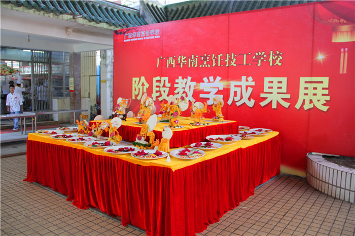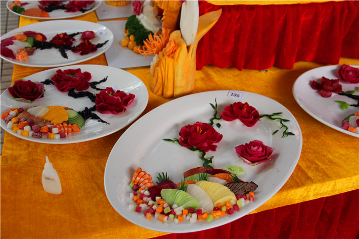 近日,广西华南烹饪学校的金牌班的同学将他们近一阶段所学的刀工成果在校园里进行了展示,颜色搭配、厚薄、整齐各方面虽稍显稚嫩,但也有模有样,看得出来同学们往日里的确非常用心。