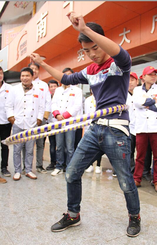 最后,轮到最精彩的项目—转呼啦圈了。虽然我校男生居多,但是矫健的身姿并不比女生差多少,一个个呼啦圈在同学们的腰间转得动得飞快。