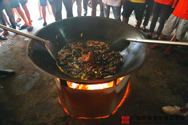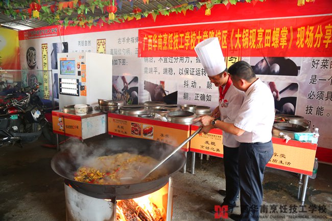 8月20日,备受欢迎的广西华南烹饪技工学校“大锅现烹田螺掌”美食活动在大学路校区隆重举行。