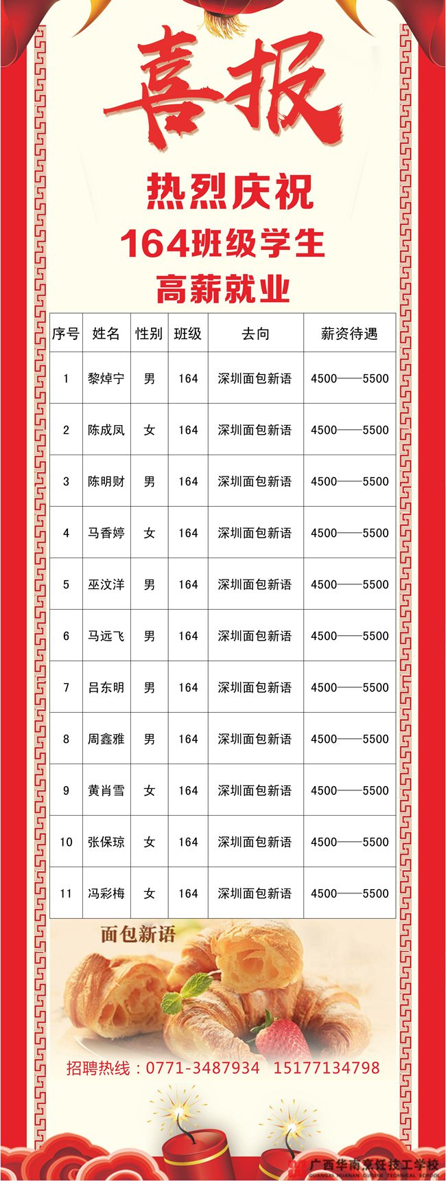 近日,我校向名企面包新语推荐的学子中,共有11名优秀学子毕业即月薪超4000,成为人生赢家已不再是梦。