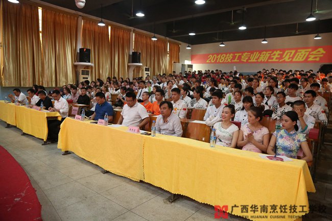 7月18日下午,广西华南烹饪技工学校2018级技工专业新生见面会于礼堂召开。校区主任黄盛、校区主任孙雄洲等领导老师出席。