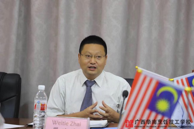 翟校长简要介绍了广西华南烹饪技工学校的专业构架和国际合作交流情况,并详细介绍了我校与东南亚烹饪类学校的合作情况。他表示非常赞同马来西亚成功礼待大学理论与实践相结合的教学模式。他说,广西华南烹饪技工学校与马来西亚高校的合作有着地缘上的优势,专业融合度也很高。他希望双方开展深度多元合作,相互学习借鉴,共同发展。