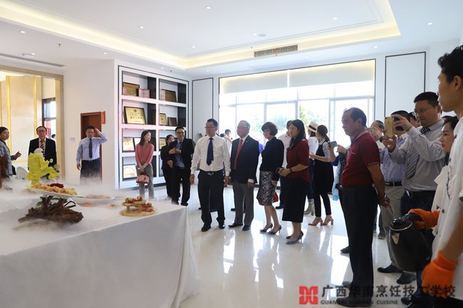 安徽长安开元投资集团副总经理杨宏兵,广西华南烹饪技工学校校长翟维铁,南宁优美西点学校校长赵志权,南宁市百美汇美容美发彩妆学校校长王勇,中国元老级中国烹饪大师何逸奎,广西人力资源和社会保障厅职业能力建设处处长杨春华、技工教研室主任覃朝俊,泰王国驻南宁总领事馆总领事蔡乐蓬蒂窝拉卫、领事吴万雅,泰国川登喜国际烹饪学校校长塔南帕,马来西亚成功礼待大学院长黄志强、执行董事何淑娟,中国烹饪协会副会长曾大文、西园鉴定所所长林海妮,阳光药业董事长黄大权等领导嘉宾以及广西各大媒体记者共同出席了新校区启用仪式。