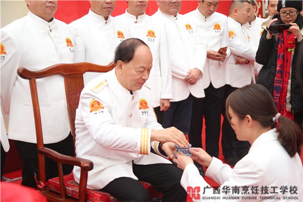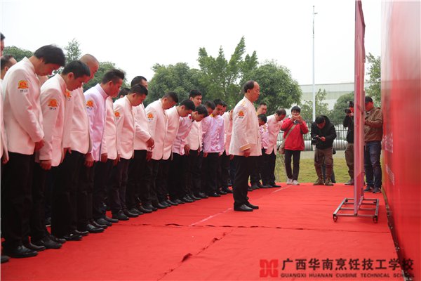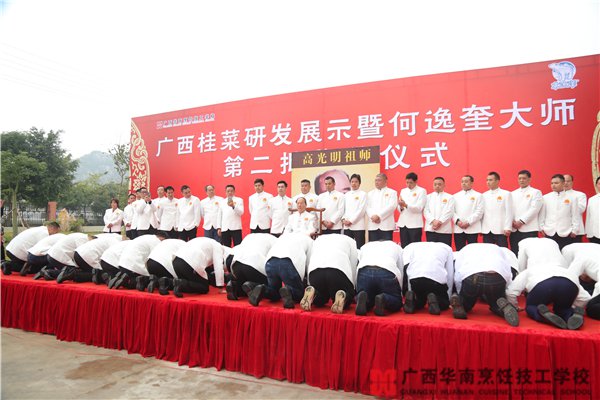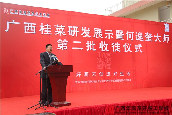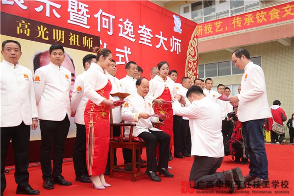 12月15日上午,和风煦日,何逸奎大师在广西华南烹饪技工学校东盟校区举行隆重的收徒仪式。本次仪式由着名导演殷新春先生主持,广西壮族自治区人力资源和社会保障厅职业能力建设处处长杨春华 、广西壮族自治区技工教研室 主任 覃朝俊、广西壮族自治区职业技能鉴定中心主任宁焱、阳光药业董事长黄大权等领导嘉宾和区内外的多家媒体朋友出席了本次活动。