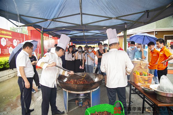 开幕仪式上,校长赵志权掌勺,周焕翔、钱瑞森两大烹饪大师协助,下锅的小龙虾个个生龙活虎,倒入华南烹饪独家秘制调料,使得龙虾肉质Q嫩。