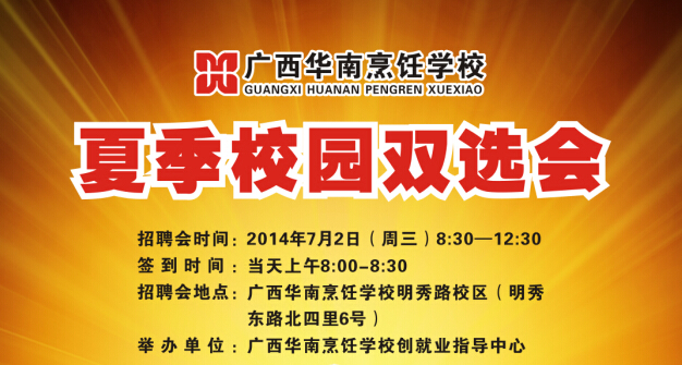 为进一步落实广西华南烹饪学校2014年毕业工作会议精神,促进用人单位与毕业学生的双向交流,为广大毕业学生提供更多就业选择机会,力使毕业生就好业、好就业,2014年7月2日,广西华南烹饪学校将在明秀校区举办2014年